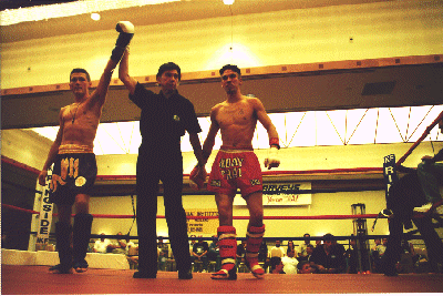 The main event was a IKF World Middleweight title fight, between Robert Coquette from Winnipeg and Eval Denton from England. There was no doubt this was the fight of the night. The first round started with both fighters showing each other plenty of respect, though I was impressed with Coquette's MuayThai techniques, they were great to watch and had a lot of power behind them, he definitely should have made his trainer proud. Denton was in superb condition, he was strong and had knockout power in both his punches and kicks. Denton was a little tentative at times during the fight, all in all the fight was strong with explosive action in all rounds. Coquette won the fight with a close decision from the judges. All in all it was a great night for MuayThai and the IKF. The next day the local paper had front page headlines about the event, and all through the day people were congratulating us on a great fight night. My congratulations to Frank and Arthur, also everyone who took such good care of us at the Days Inn.