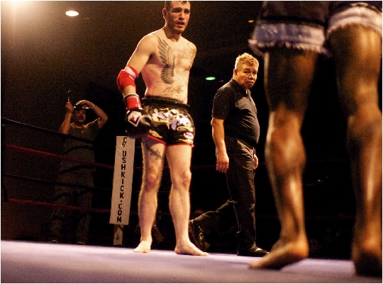 BOTH FIGHTERS MUST WEAR HEADGEAR AND SHIN PADS