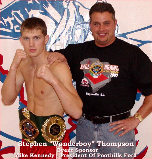CRUISERWEIGHT CHAMPION BOUT 7 They call Thompson "The Wonderboy" and well, you just have to see him face to face to know why they dare to call him "Boy" but after you see him fight, you'll see where the word "Wonder" came from. Thompson was this years 2002 IKF USA National Light Heavyweight champion and had registered for this event in the light heavyweight. However, his only challenger was the same person he beat in 44 seconds of round 1 to defend his Nationals Title (A title that he's held for 3 years in a row) this year, John Scanlon. No offense to Scanlon but Thompson knew he wanted to be challenged more so he moved up to Jardine's weight bracket and Scanlon followed him. As mentioned, above, Thompson had to face Scanlon in a prelim bout and defeat him again before moving on to face Jardin, which he did. For Jardine, at this years 2002 IKF USA Nationals he first defeated Scott Christopher of Cudaley, WI by unanimous decision, 30-25, 30-26 & 29-25. In his championship bout he defeated Jason Ross of Southaven, Mississippi by unanimous decision 30-27 on all 3 judges cards to win the National title. When the bell rang, the two went to work and Jardine saw a different level of competition then he had ever seen before. Although he has a champions skill, Jardine encountered something usually seen by opponents of pro IKF Heavyweight Champion Dennis Alexio. When your on the ropes and Thompson starts a combination, he doesn't quit until you either move, throw a successful counter or, as happened in this fight, have a referee like Dan Stell step in to give you a deserved 8 count. Although he was strong in round 1, Jardine had no answer to Thompson's non stop punch and kick attack in rounds 2 and 3 forcing referee Stell to give him standing 8 counts in both rounds. Still game with heart to match, Jardine had no plans of stopping early as he entered round 4 with his eyes wide open. However Thompson just gets stronger the longer he fights and by now he was just warming up. He was too much for Jardine who fought like a warrior, but this night belonged to Thompson as referee Dan Stell stopped this one at 1:26 of the 4th round giving Thompson the title and Jardine his first loss. |