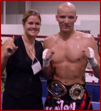 At age 14 Ryan Madigan of Cuyahoga Falls Ohio, USA started karate lessons. At 17 he entered the ring for the first time to compete in his first kickboxing bout. After an impressive amateur career of 18 wins and only 2 loses with 7 wins coming by TKO/KO, Madigan made the move to Pro status. Like many Pro Kickboxers, once there he found the fight offers few, but what opportunities that have come his way, he's made the best of them winning all 3 of his bouts without a loss. Since his phone wasn't ringing off the hook for fight offers, Madigan felt like many pro kickboxers, "If you really want something, sometimes you have to go get it yourself." What he wanted was an IKF Pro Title! So together with his partner Mark Gerberich (With Madigan below right) of Paramount Sports Marketing and his wife Allison (Both at right after Ryan's victory Saturday night) and the Madigan's company, Lion Enterprises, they hosted their first event, FISTS and FEET of FURY. The event was held at the Pinnacle Sports Complex in Akron, Ohio. The complex is a dynamic 70,000 plus square feet indoor soccer stadium. As many first time promotions go the crowd wasn't to capacity but it was full enough to offer plenty of roar for all the bouts. After a full undercard of 9 bouts (See below for reviews and results) of which 2 were exhibitions, it was time for the number 3 Ranked Ryan "The Lion" Madigan show! Madigan's good friend Dan Rawlings had just dismantled well known full contact rules fighter Keith Nesbitt in a single round (See details below) and Madigan was looking to do the same to his opponent, Kevin Hobbs of Phelps, New York. The bout was for the vacant IKF Pro MTR Super Middleweight East Coast Title. Hobbs entered the ring uneventfully (Below Left) with a pro record of 2-1 and an amateur record of 7-3. However when it was time for "The Lion" to enter the ring, he took full advantage of the moment as every fighter in a title match should. The crowd came to their feet as the music started and Madigan took his time as he walked, posed and danced his way with confidence for the hometown crowd to the ring. This kind of showmanship is what we need more in this sport. Once in the ring, the Lion dropped his elaborate fight robe (Another thing all fighters should have.) to unveil a chiselled fighting machine. Once the ring talk by referee Dan Stell was given the bell rang and the action started. Madigan started strong landing several strong kicks to Hobbs' neck. One dropped him (right) and when Hobbs didn't get up quickly (In MuayThai Rules, if a fighter stands quickly after a flash knockdown he isn't given a standing 8 count) referee Dan Stell started his 8 count. Once recovered The Lion went back to work landing several strong combinations as Hobbs failed to answer back with anything of any threat to Madigan. When round 1 came to an end, Referee Dan Stell checked on Hobbs in the corner. After asking him several times, Hobbs came up with the same answer, "No, I can't continue!" As Stell waived his arms to call the bout the hometown crowd went wild as Ryan "The Lion" Madigan became the new IKF Pro MTR Super Middleweight East Coast Champion with a win by TKO! The win puts Madigan in position to strive for yet another level in the MuayThai Super Middleweight division such as a shot at the vacant IKF USA or North American Title. Here's the results of all the nights action below. |