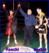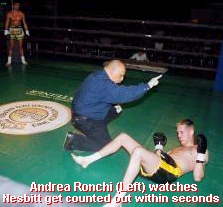 On August 24th, (Below) in Ohio, MuayThai fighter Dan Rawlings gave Nesbitt a strong lesson in leg kicking and a beating to go with it, stopping him in the first round of their scheduled 5 round bout. It should have been a wake-up call for Nesbitt not to venture into another leg kick bout until he learned more about checking kicks, especially against someone as strong as Ronchi.
