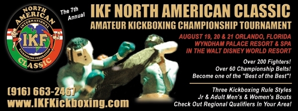 Who else was in the running? Believe it or not, parts of Canada and the State of Texas were strong in the beginning. However their Athletic/Boxing Commissions (Provinces here the Hotels with the best bids were located) do not allow MuayThai or International Rules. Other locations with large airports such as Chicago, Atlanta and St. Louis were put aside early due to high hotel costs. In the Hotels that had ballrooms large enough for this event, the lowest room rate we received was $129.00. Other locations had some good offers but no available dates in July or August. A lot of locations wanted to offer us the 4th of July weekend or Labor Day weekend. A note that we will remember when it comes time to select our 2006 location. We had several bids from California but the State Commission here will not allow Tournament style bouts and the Commission fees would kill us as they do most California promoters. So there it is everyone. We will be in Orlando this year for the 2005 IKF North American Classic Tournament. We know, as there is every year, great sacrifices to be made to make it there to "Walk The Walk." We can assure you, we are NOT looking forward to doing that 3,000 mile drive again. If anyone knows any Motorcoach people, we would love a sponsor for this years trip. Than we could pick up Uncle Brooks along the way. Regardless of the issues we all know about, making and "Confirming" the 2005 location so early gives us all more time to make this event better than ever. As every year we will be seeking the required sponsorship to make this event happen. The "TITLE" sponsor (Such as TKO and Ringside have been in the past - IKF/TKO NAC Tournament or IKF/RINGSIDE Nationals Tournament) has not been named yet. In fact, we haven't even asked anyone if they want to be Title Sponsor for the 2005 Tournament yet. We have been too busy sorting through all these location proposals. Not to mention the over 900 e-mails related to this event that we have sorted through too. So if you have any ideas or anyone interested in being the event "TITLE" Sponsor or sponsoring anything for the event such as Fighter/Trainer meals, gifts for the Fighters & Trainers welcome package they will get this year at registration, etc. etc., please e-mail such info to us to main@ikfkickboxing.com This will keep us pretty busy here. However, you too need to get started. Don't just "Walk the Walk" this year, do it with Pride and BE NOTICED! By this we mean, get those Team UNIFORMS! Remember those Teams that had them this last year? Look at some of the photos above. Those Teams not only stood out, but stood out in STYLE! If you are looking for Sponsors, get your sponsors names on those uniforms. sponsors want and need exposure and Team Uniforms are a great way to give them the exposure they desire. Find "NATIONAL" or even "INTERNATIONAL" Sponsors because this is an event that will reach outside your community. Enough said... It's time we all get busy to "Walk The Walk!" Of course... after all of you, and us too, have a