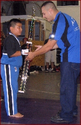 As the day nears, Kickboxing teams from across the state are anticipating the event. Phone calls are mounting with interest as several Kickboxing schools who have heard the buzz are now showing great interest and entering their teams. Men, women and Junior will fight for beautiful 4' trophies and the glory of the WIN! Manuel Viscarra (Right) of Aztec Kickboxing of Dixon, CA awards 4' first place trophy to one of the competitors at our last event.