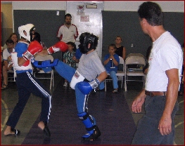 Registration will start at 8:PM and elimination start at 10:AM. The all too important rules meeting for everyone will start at 9:30. Since there are no knockouts in IKF Point Kickboxing, newcomers are encouraged to be sure to make the rules meeting. There is little leniency on the rules and judges are not shy to disqualify for too much contact. Instructor Dale Sussdorf (Left) of Woodland, CA watches closely for points in a junior match.