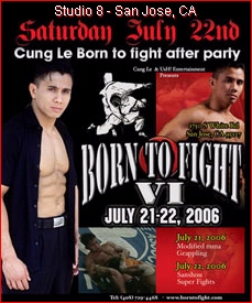 By Elaina M. Maxwell: Twelve exciting bouts took place at Cung Le's Born To Fight VI Superfights on July 22, 2006 at Mt. Pleasant High School in San Jose, CA. The evening produced 9 decisions, 1 TKO, and 2 technical draws. A special thanks to teams who trained these fighters: Team USA, West Valley College, South Bay Fight Club, American Kickboxing Academy, Fight and Fitness, Cheetah's Muay Thai, Omei Kung Fu, Calvin Chin, Cung Le MATC San Jose, and Cung Le MATC Santa Clara.