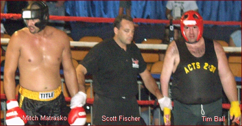 When Tim Ball of Pennsville, New Jersey finished fighting Mark Snow of Lake Zurich, Illinois, few waited for me to announce Tim's situation. Nearly everyone at Ringside at ring 2 stood to their feet and gave Tim a standing ovation for his efforts. When the applause quieted down, I explained how Tim had went through months of waiting for us at the IKF to make a decision whether or not to allow him to fight. We had several e-mails in support of him competing and finally, we made the decision to allow him to compete. I said to everyone there, "We decided, if Tim Ball wanted to walk the walk, we weren't going to stop him!" And the place erupted with yet another standing ovation.