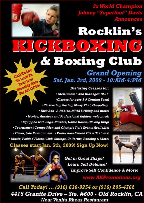 Yes, Davis' school will also be a gym for fighters. Johnny and his wife Helen would like to invite you all to the Grand Opening of the their new facility, the Rocklin Kickboxing and Boxing Club, (RKBC) this Saturday, January 3rd, 2009 from 10:AM to 4:PM. There will be Food and Music at Noon! RKBC is located at 4415 Granite Drive, Suite 600, Rocklin, CA, 95677.
