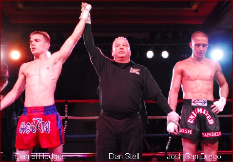 • QS: A close-fought split decision between Daniel Hodges and Josh San Diego for the IKF West Coast Welterweight title. San Diego won the earlier rounds with his evasive fighting style, moving in to land strikes and moving out to evade the counter. But as the fight progressed Hodges was able to trap San Diego in the corners of the ring, doing damage once San Diego ran out of room. The last two rounds belonged to Hodges, with the fight decision coming down to a very close third round. Two of three judges scored the fight for Hodges.