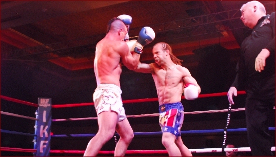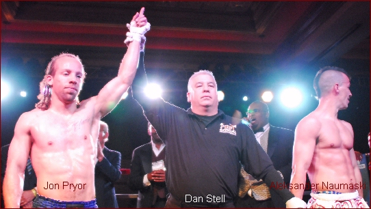 • QS: The main event of the evening was a tilt between Jon Pryor and Aleksander Naumaski for the vacant IKF Super Welterweight Muay Thai World Title. Each fighter in the match had their strategy and stuck to it through all five rounds. Pryor pressed forward, throwing hooks to body and head. Naumaski looked to tie up Pryor in the clench and score with leg kicks. Pryor clearly looked frustrated by Naumaski's tactics as his trademark power was smothered in the clench and Naumaski's leg kicks continued to land. But Pryor continued to land body blows and after five rounds was able to edge out the victory and claim the title, 48-47 on all three scorecards.