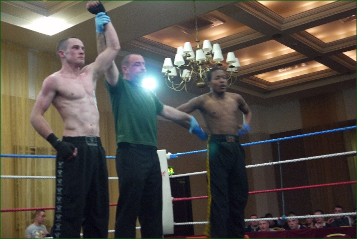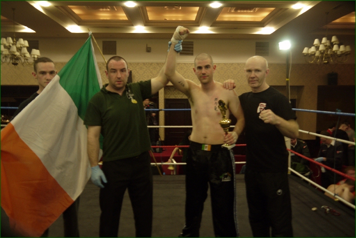 The last fight of the night featured IKF World Light Heavyweight champion Cathal Manning and he faced up to Frances Anthony Pinto. Manning opened the round with some powerful kicks to Pintos midsection that could be heard all around the venue but Pinto fired back and it was shaping up to be a really good fight. That is until midway through the round, Manning caught the Frenchman with a savage left hook to the body. Pinto went down hard to the canvas where he stayed and was counted out by Referee Mick Burke from Dublin. Immediately after the count referee Mick Burke called for the ringside doctor. The doctor revealed that at least one of Pintos ribs was possibly broke and the Frenchman will be out of action for quite a while. Manning, who is this years Galway Bay FM sports star of the year for Kickboxing added yet another knockout win to his impressive CV and the Black Dragon gym had shown that their fighters can mix it up with the best.