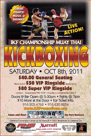 Along with tomorrow nights event, another AK Promotions event has been scheduled for October 8th at the Oakland Convention Center in Oakland, California, USA in preparation for the First Annual IKF West Coast Classic Tournament that will be held in Sacramento at the Sacramento Radisson Hotel in late November. The First Annual IKF West Coast Classic will have fighters from around the world participating in this "Golden Glove like" tournament in assorted rules styles adding to a full weekend of action-packed fights, vendors, movie stars and more... Simply put,