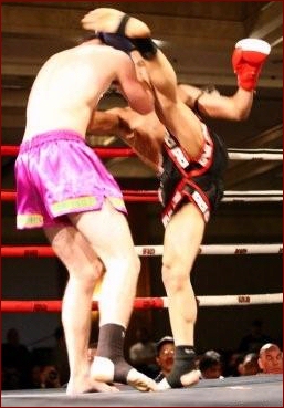 Having what it took and now sporting an 11-1 record, Arcangle has defeated all in his path with the exception of one who has since moved on to professional mixed martial arts. Even that loss was questioned by many but after all, it is the fight business where judging is subjective. Along the way, Arcangle has won International Kickboxing Federation ( IKF) California and a United States Muay Thai Kickboxing Titles and is now set to fight for the IKF World title. (Pictured below right, Arcangle lands strong kick to head of opponent)