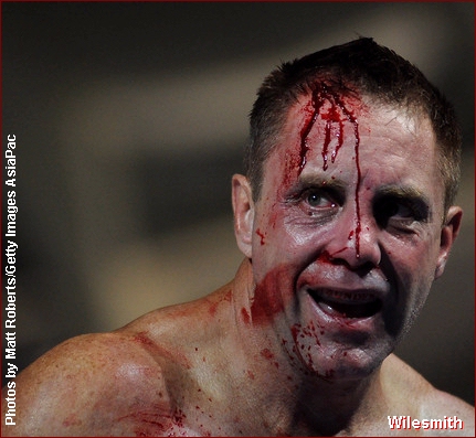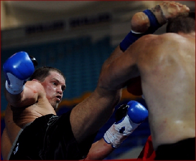 of my ol rugby techniques." Clearly the headbutt was caused when Wilesmith's head leaned into Sheppard, however, days after the bout, Wilesmith had a different memory of the moment when giving an interview to the Australian media. "We clashed heads," Well, to begin with, Wilesmith is right on one account, it did look like he did it intentionally, but the "HE" was Wilesmith, NOT Mike Sheppard. As direct ringside eye witnesses of this bout we were pretty shocked to read this on the internet. Although an uneventful round, as the round came to an end, there was no question as to who won it. If not for the inexperience of one of the "Australian" judges (found later to be selected by Wilesmith) Sheppard would have won round 1 on all 3 judges cards, 10-9. However, the Wilesmith - Australian judges gave round 1 to Wilesmith, despite him only landing a few jabs, and we "Literally" mean a few, as in THREE. As round 2 started, Wilesmith's corner had stopped his head from bleeding so the fight was on again. However, as this round started, Sheppard realized he wasn't afraid of any "Thunderlegs" so he came out strong. Sheppard rocked Wilesmith with body shots and left - right combinations along with several kicks including a good head kick. To his credit, Wielsmith proved one thing, that he had a hard head but even a rock can take a strike, it doesn't express it has "Talent or Skill". As the round was closing out, Sheppard landed some bombs on Wilesmith that rocked him. Instead of covering up as most fighters would to protect themselves, Wilesmith smiled at Sheppard and actually waved him to come again. Wilesmith wanted everyone to "Think" he was having no problem taking Sheppard's blows, yet in reality, it was just the jesters of a fighter who had no answer to his opponent's offense. Saying that Wilesmith weathered Sheppards storm is not a compliment of skill... Having a hard head is not a compliment of skill... However, it's what Wilesmith kept doing which seemed to be the only things keeping him in the fight. As the round came to a close, this time there was no question as all three judges saw this round easily 10-9 for Sheppard. As round 3 started, Sheppard came out with no hesitation scoring punch after punch to Wilesmith's head and body. What many had hoped to be a tremendous fight quickly turned into a one sided frenzy or more so, the bushwhacking nearly everyone in Australia warned the IKF it would be! Sheppard was now landing shot after shot without any real resistance. Wilesmith would continue his only reply which was to smile back at Sheppard as if he wasn't hurt, but at ringside, the message was clear. Wilesmith was in PAIN!" From the corner prior to the 3rd round, Wilesmith was drained. Not only did he not have any answers to Sheppards attack, he had no gas ( endurance ) to even stand up to weather Sheppards shots anymore. Sheppard charged several times as Wilesmith just turned his back to him like a fledgling fighter who was just scared or had never fought in a real bout. It was clear this bout was coming to an end soon. As we past the 1 minute mark in round 3, Sheppard drove the bloodied and battered Wilesmith into his own corner. It was there that Wilesmith would turn his back again to try and escape Sheppard. After World Class Referee and former Champion Kickboxer himself, Dan Stell (Click here to read about Stell's experience) stopped Sheppard from his attack, the two squared up again. A few blows later and Wilesmith was leaning over. Sheppard could have very well landed several telling head shots, but almost as if he felt sorry for him, Sheppard choose to go to the body instead to finish Wilesmith off. Finally Wilesmith went down. Stell started the count, but Wilesmith would not make the count. This long awaited bout was over and Elizabeth, West Virginia, USA's Mike Sheppard would win the IKF World Title by KO at 1:33 of round 3. Sheppard improved to 23-10-1 with 17 wins by stoppage while Wilesmith adds a loss to his record, whatever that record is or was claimed to be. A loss that will likely be his last kickboxing bout. WHAT BOUT WERE YOU WATCHING? "Thunderlegs once again proving why he has that nickname as he destroyed Sheppard's legs." However, we had to ask what fight the writer was watching because Wilesmith's legs were no concern to Sheppard in this fight. Even Wilesmith's corner wondered why he never even turned his hips into any of his kicks. Maybe it was inexperience in the ring or fear of Sheppard countering? Who knows. What we do know is Wilesmith didn't throw "1" strong landing leg kick on Sheppard all night! NOT EVEN ONE! So to say Wilesmith "Destroyed" Sheppards legs comes from the eyes of a blind man. TRYING TO SAVE FACE... There's an article out there on the internet (CLICK HERE) that has some comments such as "but the loss of blood form the head gash and a broken nose took its toll." Bloodloss had NOTHING to do with this bouts outcome!! Sheppard simply beat Wilesmith down with shot after shot from rope to rope, corner to corner. Yes, Wilesmith was bleeding quite a bit, but to say the blood was "Gushing" is an over statement. We've seen a lot worse blood in some elbow cut Muay Thai fights for example. Along with this comment, Wilesmith has made quotes such as, "If it wasn't for the head clash, I reckon I would have won." Well, not sure what bout he was thinking about because after round 2 started, we saw this bout only going one way, Sheppard's! At age 47, Robert Glasson-Wilesmith got his shot. We will say that he "Walked the Walk" when he could have turned away. He took his criticism all the way to the ring. However, with comments like the ones we noted, we can only hope his ego does not overshadow his deserved pride. The only sad thing is how this bout is now being played out in the media with quotes from Wilesmith and writers who interviewed him saying, it was a "Tremendous fight" or an "Out right War" are FAR from the truth. This was no close bout. As we noted a
