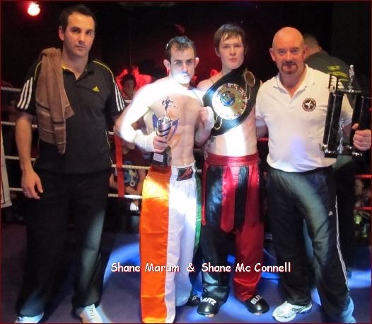 IKF Promoter Pat Rockett put together a first class International Kickboxing show in the Crystal Nightclub, Waterford this past Saturday. The event featured an action packed IKF All Ireland Lightweight Title fight between the countrys two top seeds, Shane McConnell from Waterford and Shane Marum from Portlaoise. These two fighters both won their eliminator bouts for the right to fight for the title and it turned out to be an excellent contest with Mc Connell taking the laurels on this occasion. Marum was determined and hit the scales on the money at the weigh-ins but Mc Connell, who had to go and drop weight, seemed to have that little bit extra and landed some crisp shots on the Portlaoise man which caught the judges eyes.