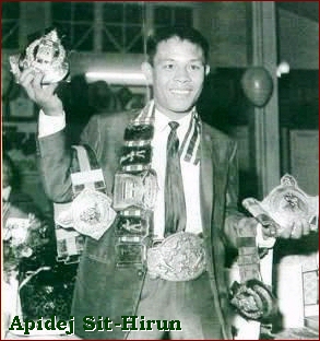 He was also known as "The Man of 7 Titles" - "The Legendary Best Muaythai Kicker of the Century" and "The Best Muaythai Fighter of the Century". Titles awarded by the Authority King of Thailand. Apidej was the first and only legendary Muaythai fighter in Thailand to be recognized and showcased by the Thai National Museum for a "Life Time Achievement" and for making an impact to Thailand's sporting history. An Honorary bronze statue of Apidej is proudly displayed at the Huamark Indoor Stadium, Bangkok, Thailand.