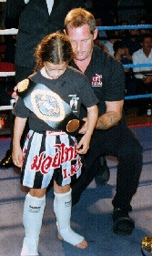 The show started with the IKF Girls Junior Bantamweight title betweenJESSICA ISSAC'S - Kirkby Thai boxing & GEMMA DEAN - Wolf Thai boxing. As referee CLIVE TENNANT got the show on the road, with an all action battle, with neither of the dynamo's giving ground. The Girl's threw everything at each other, bar their cornermen. At the bell a very close decision went to JESSICA ISSAC recieving title belt from Mr. Alby Bimpson at right.