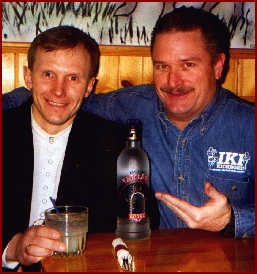 Dobrotvorski (Kotelnikov) (L) of Minsk, Belarus shows IKF President Steve Fossum how to drink "REAL"